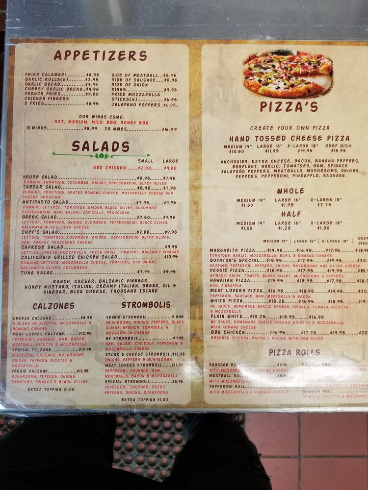 Boynton Pizza, located in Boynton Beach, FL, offers a diverse menu featuring pizzas, Italian dishes, and sandwiches. The restaurant provides various amenities, including delivery, takeout, reservations, vegetarian options, and wheelchair accessibility. The casual and quiet atmosphere, along with options for outdoor seating and catering, make it suitable for families and groups. Notable items on the menu include fried calamari, garlic rolls, wings, spaghetti with meatballs, and a variety of appetizers. The establishment also offers a selection of drinks and specials on beverages. With its convenient location and extensive menu options, Boynton Pizza is a great choice for those looking for a satisfying meal with a variety of choices.